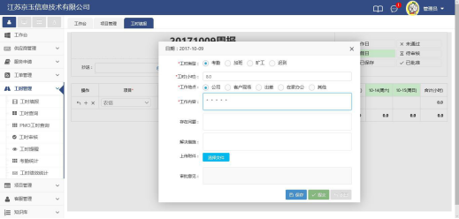 彈出對話框之后選擇工作類型和工作地點,填寫工時(一天工作考勤時間滿勤為8小時,超過8小時部分請?zhí)罴影啵┖凸ぷ鲀?nèi)容,存在問題和解決措施選填。如果工作中有重要文檔 請上傳附件。審批意見在工時駁回后會同步,填報時不可填寫。如果確認點擊保存,放棄點 擊返回。